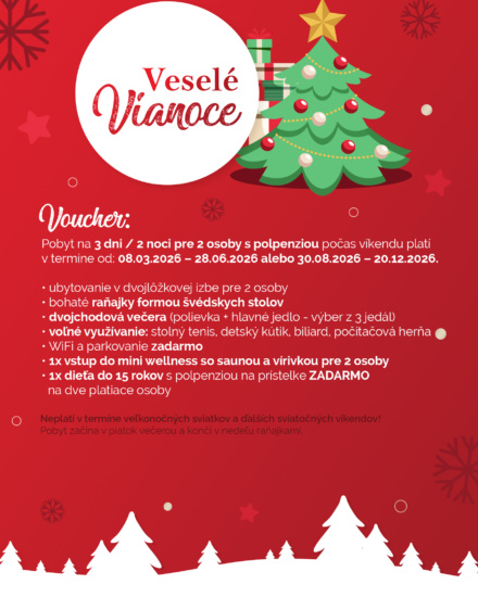 Hľadáte tip na Vianočný darček? Darčekové poukazy ktoré si pre Vás pripravil Penzión*** Horec môžu byť pre Vás tou správnou voľbou! Potešte svojich blízkych víkendovýmpobytomplnýmrelaxu v srdci Nízkych Tatier. Stačí vyplniť formulár a my Vám poukaz s menom obdarovaného zašleme vytlačený poštou na adresu, pripravený na darovanie pod stromček. Majiteľ poukazu si následne môže vybrať termín ktorý mu vyhovuje a zarezervovať si pobyt pre 2 osoby s dieťaťom do 15 rokov ZADARMO!